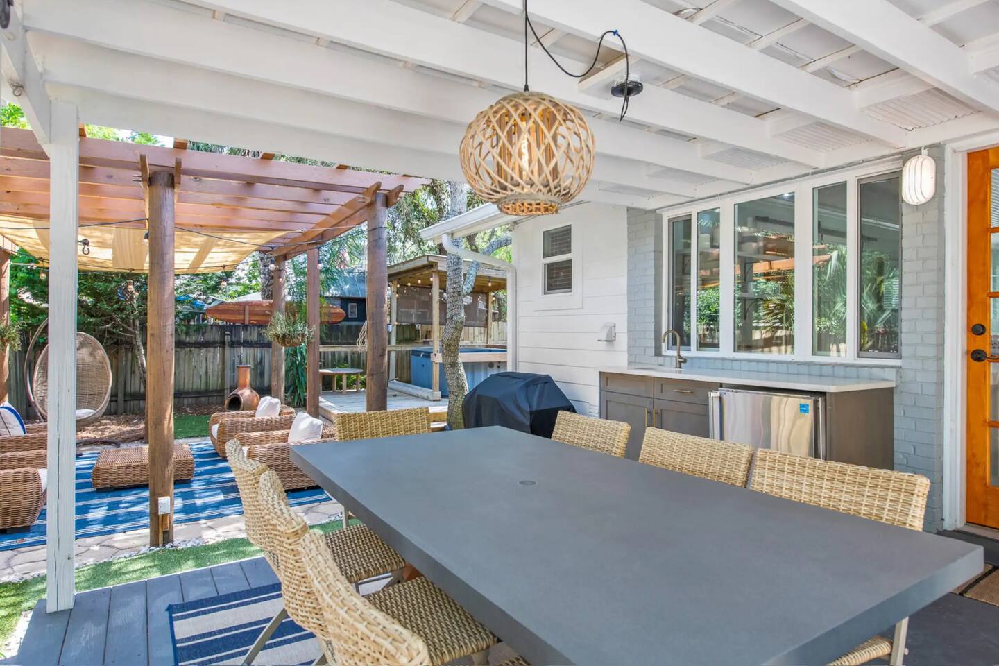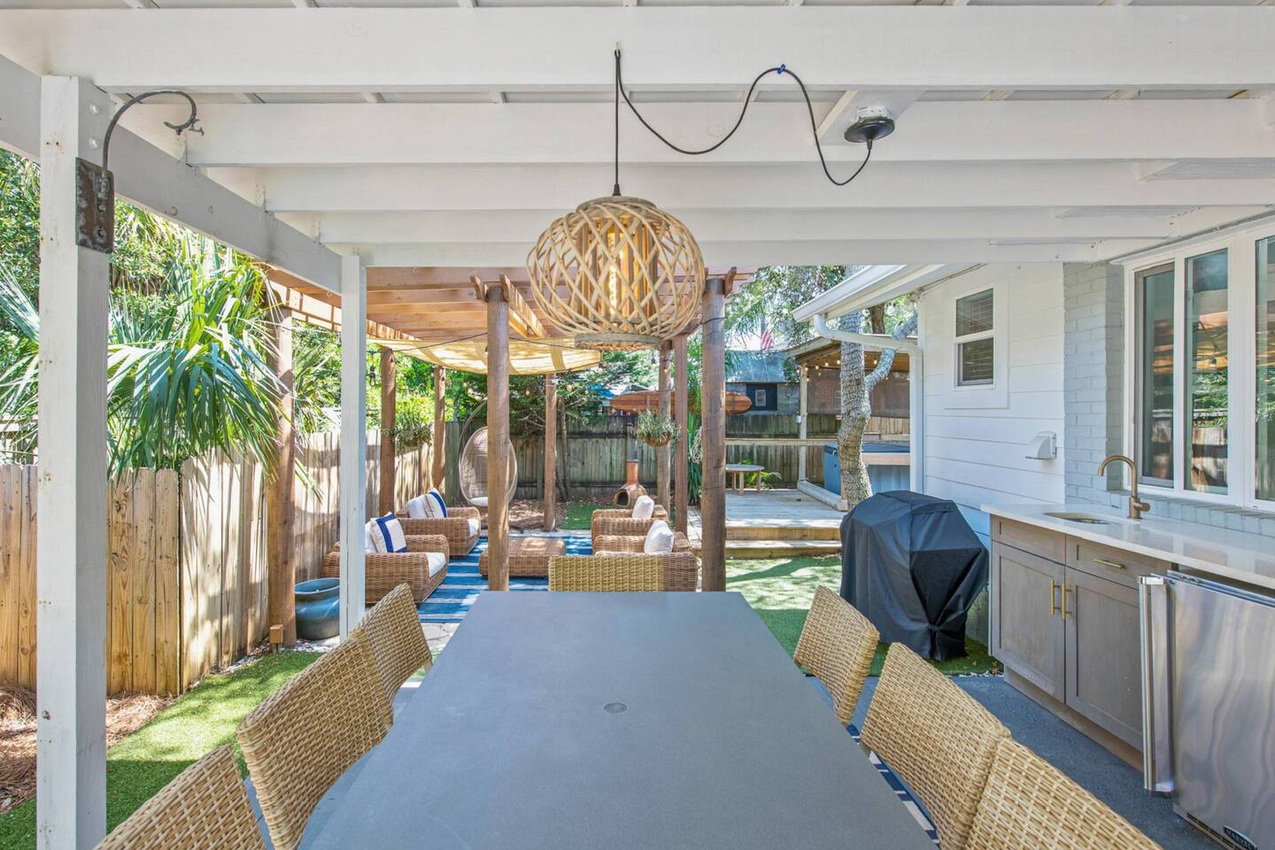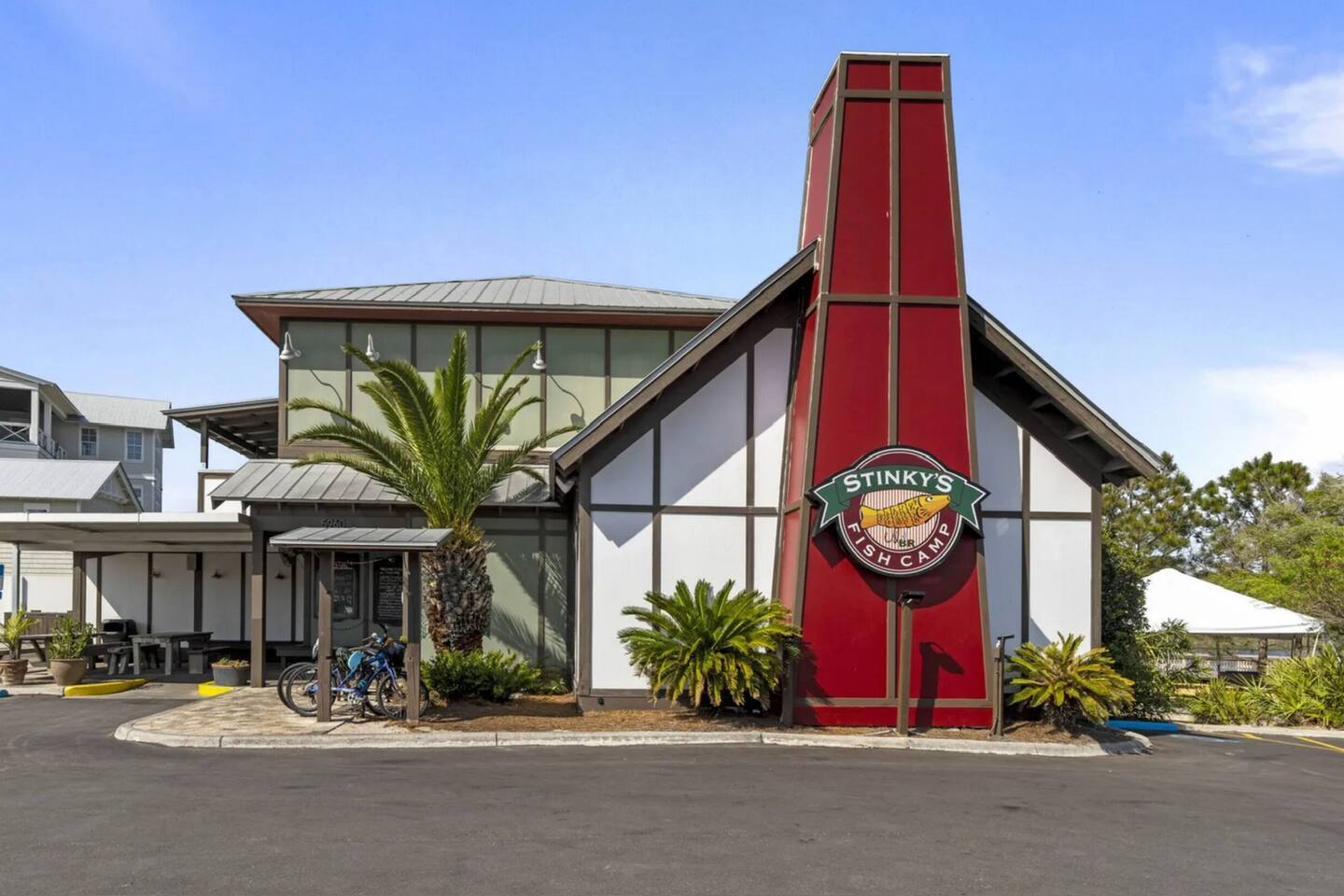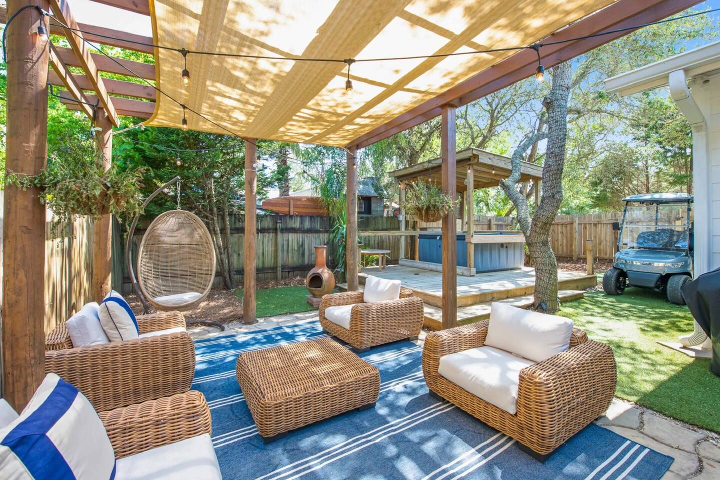 Welcome to Sally’s Speakeasy! Your stay includes complimentary use of a 2024 6-seater golf cart—a $150/day value, included free for guests! Cruise to two nearby beach access points, both less than half a mile away. This home is loaded with everything you need for the perfect beach getaway, including: • Golf cart • BBQ grill • Outdoor dining + lounge areas • Outdoor shower • Hot tub under a shaded pergola • Exterior bar with quartz counters • Indoor wine fridge/bar • Beach chairs, umbrella, and board games All you need to bring is your beach towels! Inside, you’ll find high-end furnishings, designer finishes, and an open-concept layout. The fully stocked kitchen features quartz countertops, stainless steel appliances, and island seating. Enjoy your meals indoors or outside under the string lights surrounded by mature trees—perfect for morning coffee or evening cocktails. Entertainment-ready, the home includes Smart TVs in every bedroom and the living room (log into your own streaming accounts), plus board games and cards for family fun. Sleeping Arrangements: • Primary bedroom: King bed • Bedroom 2: Queen bed • Bedroom 3: Bunk room with Full-over-Full beds • Sleeps 8 total • Full laundry room • Parking for up to 3 vehicles Location Perks: Walk or ride to some of 30A’s best dining: Blue Mabel (walking distance), Shunk Gulley, Goatfeathers, Perfect Pig, Pizza by the Sea, Local Catch, The Vue, Stinky’s, Red Bar—and don’t miss sweet treats from Blue Mountain Creamery and Charlie’s Donuts! Everything about Sally’s Speakeasy is designed to make your stay easy, relaxing, and memorable. We’d love to host you!