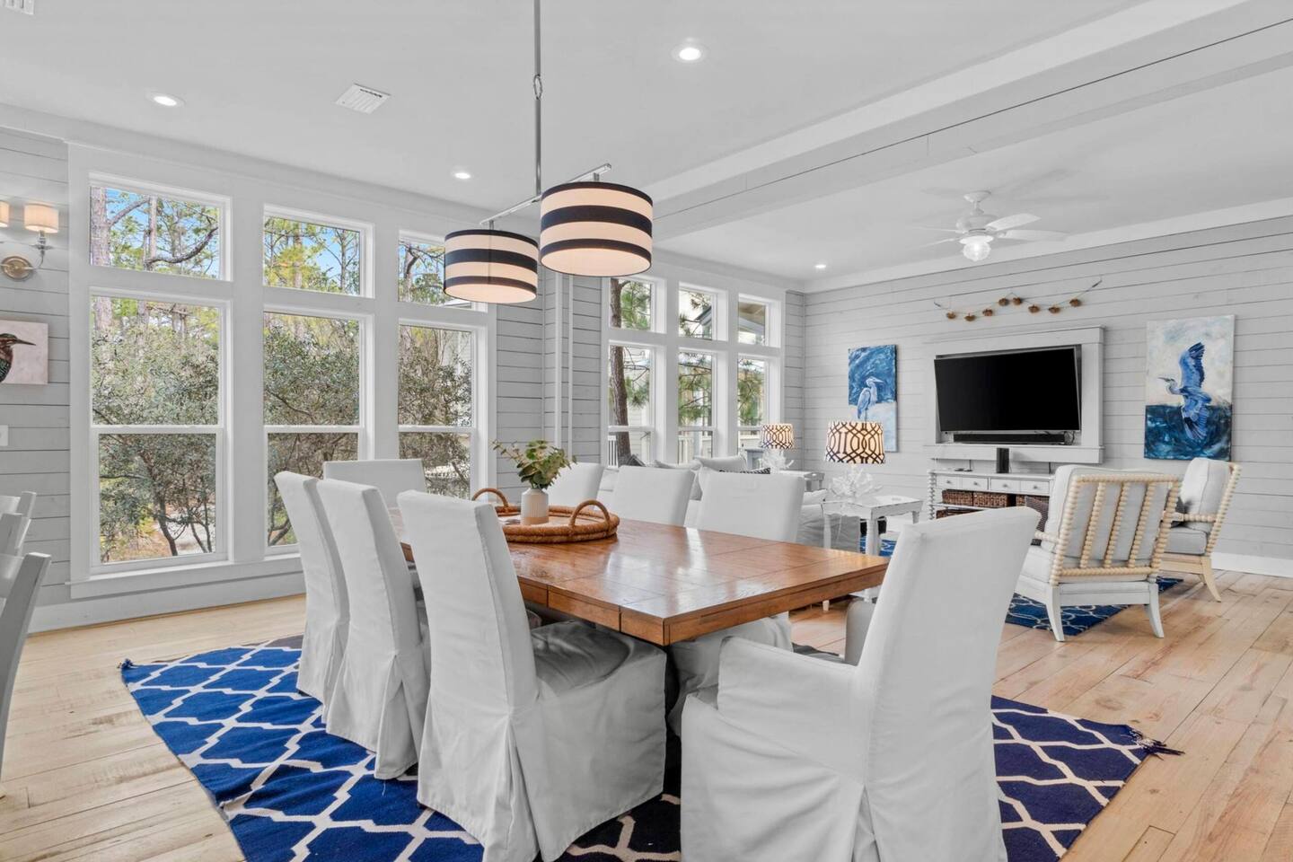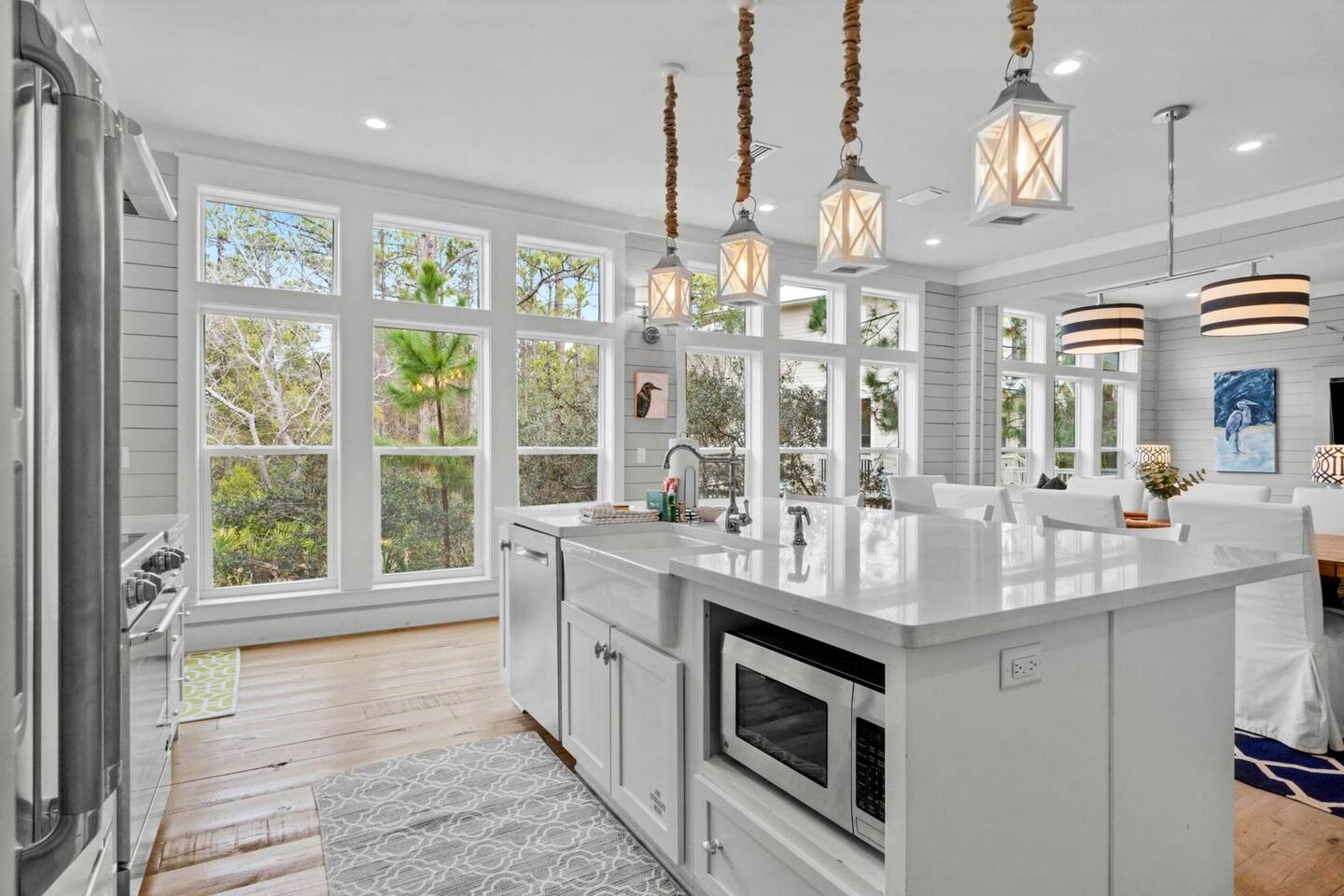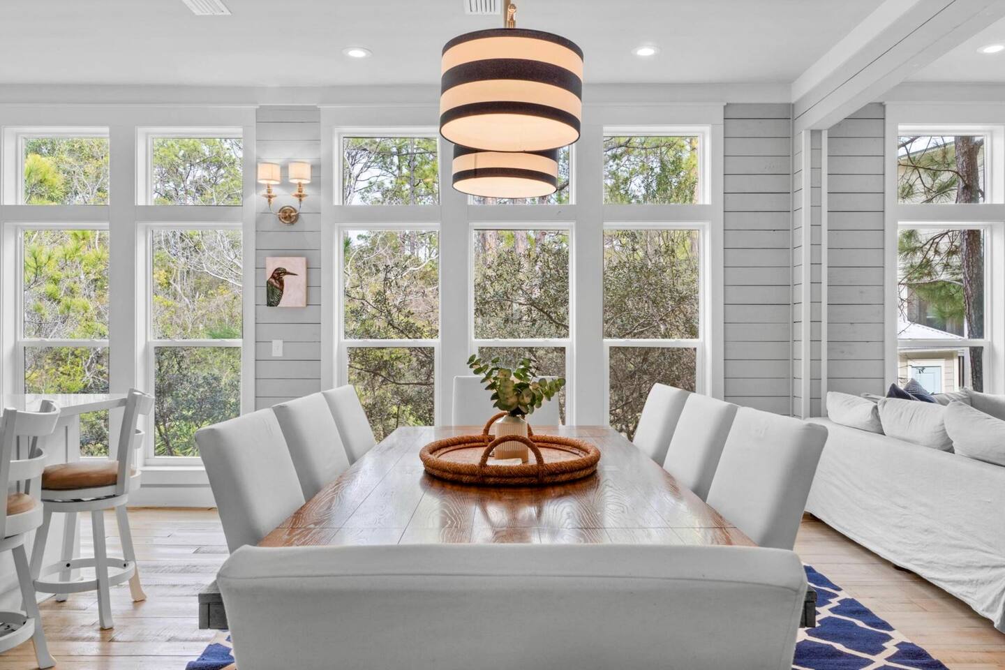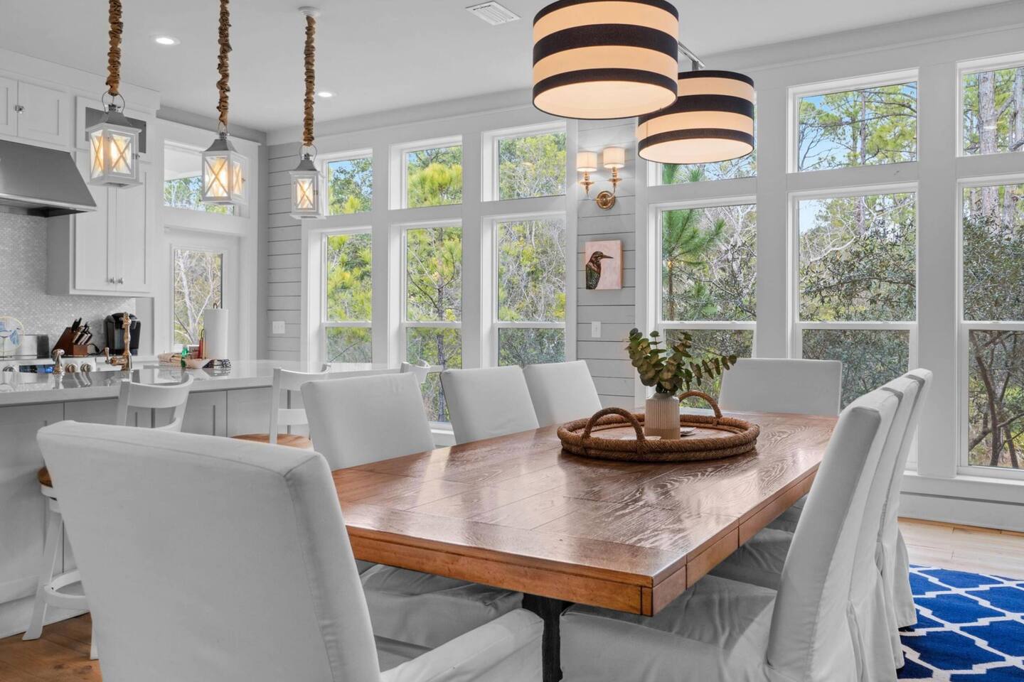 Tucked away on a quiet cul-de-sac, the house sits on a wooded nature trail surrounded by nature preserve perfect for exploring in the time between beach days and poolside fun! Main Floor A gracious entry leads to the open concept living, dining and kitchen area flooded with natural light with floor to ceiling windows. The dining table, positioned to separate the kitchen and living area, easily accommodates 8 guests. The chef's kitchen is large and open, providing enough room for cooking and entertaining! You will also find a half bath on the main floor as well as a walk in laundry room. The main floor of the home conveniently offers a KING room with an ensuite bath and walk in closet. From the main floor porch, take the stairs down to find the outdoor dining and grill area backing up to the preserve and nature trail. Second Level You will find a second living space and half bath. Off of the living room area you will find a bunk room with trundle bed and walk in closet, guest room with DOUBLE QUEEN and ensuite bathroom and walk in closet. Master Suite with KING Bed and ensuite bathroom, walk in closet and private screened balcony. This home also provides your an outdoor dining area and grill area, just off the back porch and next to the wooded preserve and nature trail. This highly desirable community is perfectly positioned between Rosemary Beach and Alys Beach making it an ideal location to walk or bike, and to explore all that 30A has to offer with shopping, dining and entertainment right at your doorstep. Book it!