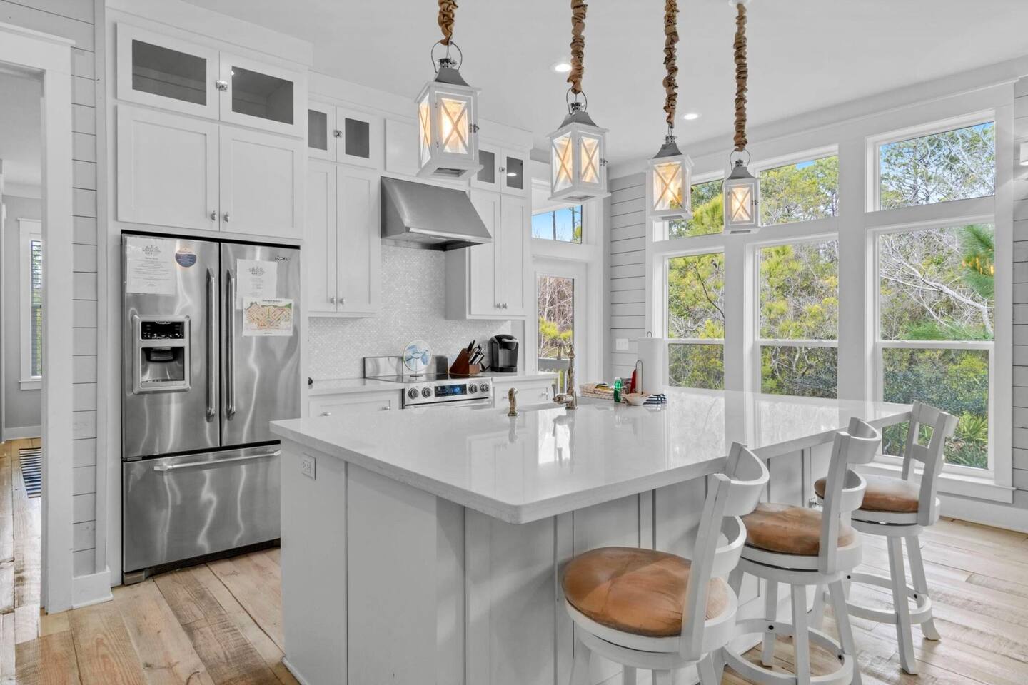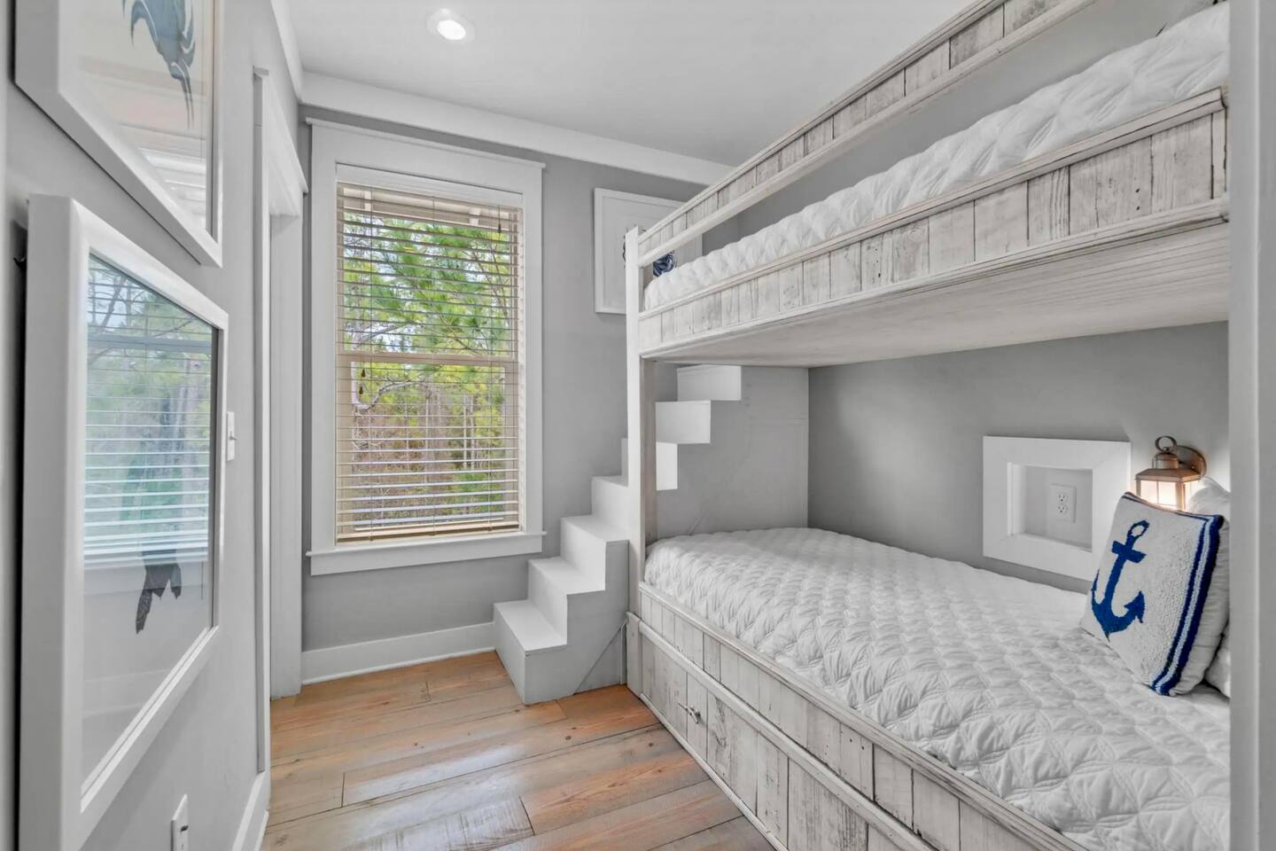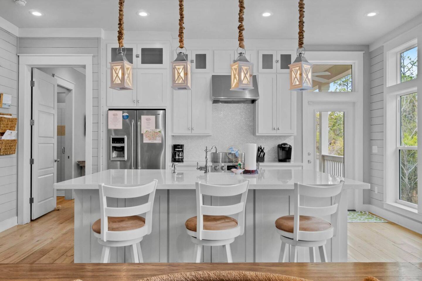 Tucked away on a quiet cul-de-sac, the house sits on a wooded nature trail surrounded by nature preserve perfect for exploring in the time between beach days and poolside fun! Main Floor A gracious entry leads to the open concept living, dining and kitchen area flooded with natural light with floor to ceiling windows. The dining table, positioned to separate the kitchen and living area, easily accommodates 8 guests. The chef's kitchen is large and open, providing enough room for cooking and entertaining! You will also find a half bath on the main floor as well as a walk in laundry room. The main floor of the home conveniently offers a KING room with an ensuite bath and walk in closet. From the main floor porch, take the stairs down to find the outdoor dining and grill area backing up to the preserve and nature trail. Second Level You will find a second living space and half bath. Off of the living room area you will find a bunk room with trundle bed and walk in closet, guest room with DOUBLE QUEEN and ensuite bathroom and walk in closet. Master Suite with KING Bed and ensuite bathroom, walk in closet and private screened balcony. This home also provides your an outdoor dining area and grill area, just off the back porch and next to the wooded preserve and nature trail. This highly desirable community is perfectly positioned between Rosemary Beach and Alys Beach making it an ideal location to walk or bike, and to explore all that 30A has to offer with shopping, dining and entertainment right at your doorstep. Book it!